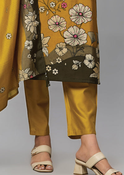 Dark Mustard Printed Modal Silk Straight Cut Kurti With Sequence Work, Matching Pant & Printed Dupatta