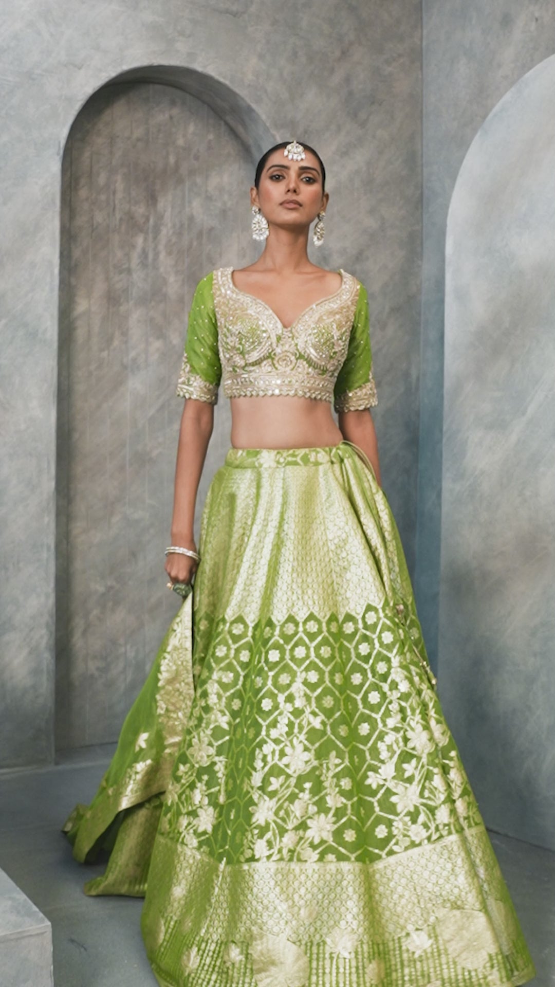 Experience freshness and flair with this apple green Banarasi tissue lehenga from Taruni, styled with a hand-embellished blouse and rich Banarasi dupatta. A stunning blend of soft color tones and heritage textures — ideal for day functions or haldi.
