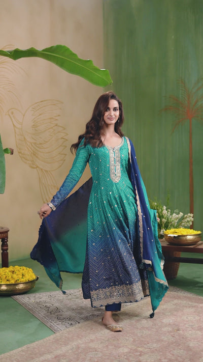 Light Blue & Ink Blue Shaded Bandhini Printed Soft Silk Anarkali With Zari & Sequence Work, Matching Pant & Same Shaded Chinnon Dupatta