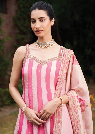 Soft And Graceful, This Light Pink Tissue Anarkali By Taruni Is Adorned With Intricate Zardosi And Stone Detailing—Ideal For Bridal Parties Or Day-Time Festivities.