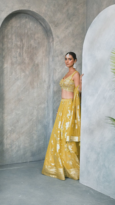 A radiant celebration of tradition — this Taruni yellow Banarasi lehenga is paired with a delicately hand-embroidered blouse and a coordinated Banarasi dupatta. A perfect festive pick that reflects timeless elegance with Taruni’s signature detailing.